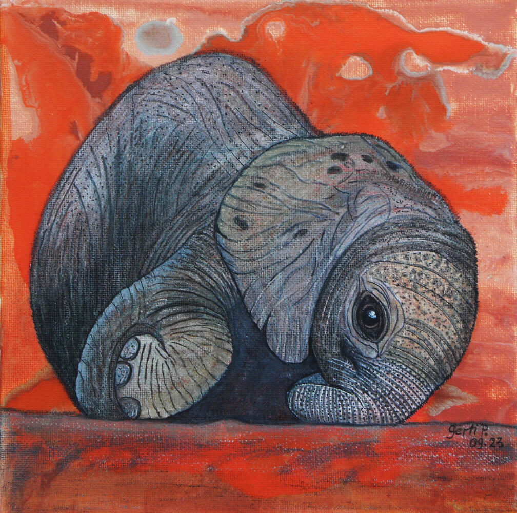Original 2023 • 300,- € • 30 x 30 cm • Tusche auf Leinwand, im rotbraunen Holzrahmen, matt, 2 cm breit